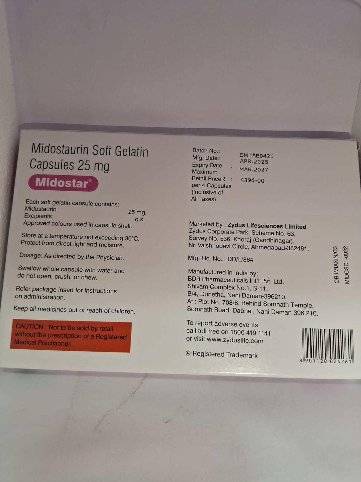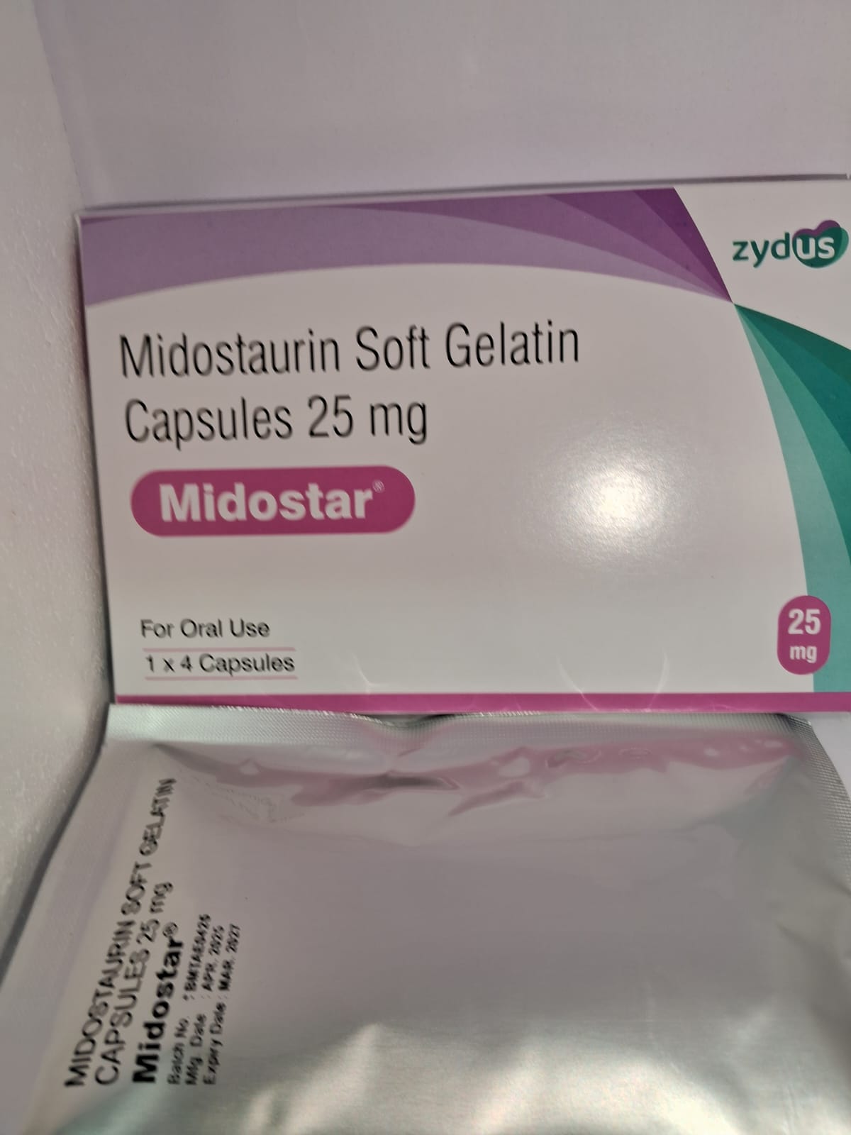 PRODUCT SPECIFICATION Strength / Dose: 25 mg per capsule Dosage Form: Soft gelatin capsule for oral use Packing Type: Capsules in blister or bottle, packed in carton Treatment: Used in the treatment of certain types of acute myeloid leukaemia (AML) and advanced systemic mastocytosis (per approved indications globally) Prescription Type: Prescription only (Rx) Generic Name (Drug Name): Midostaurin Brand: Midostar